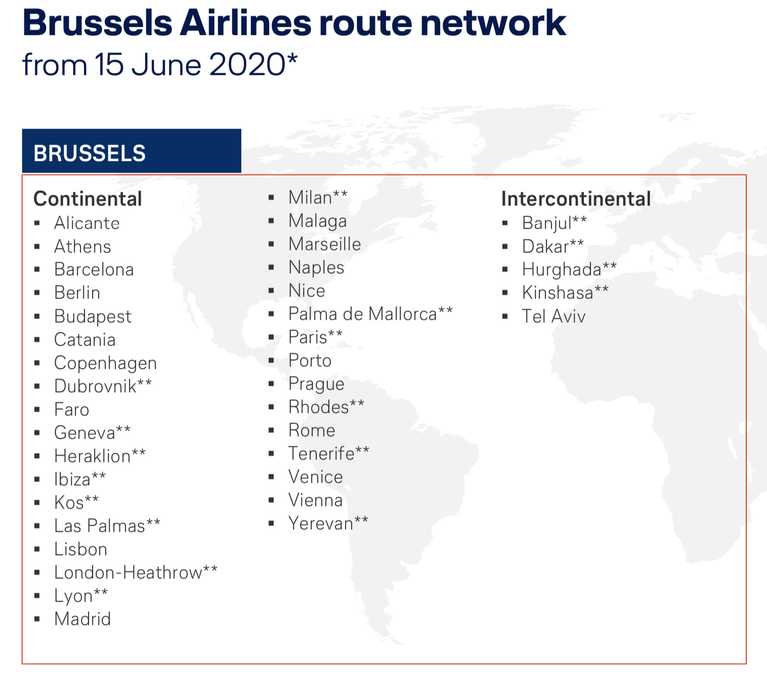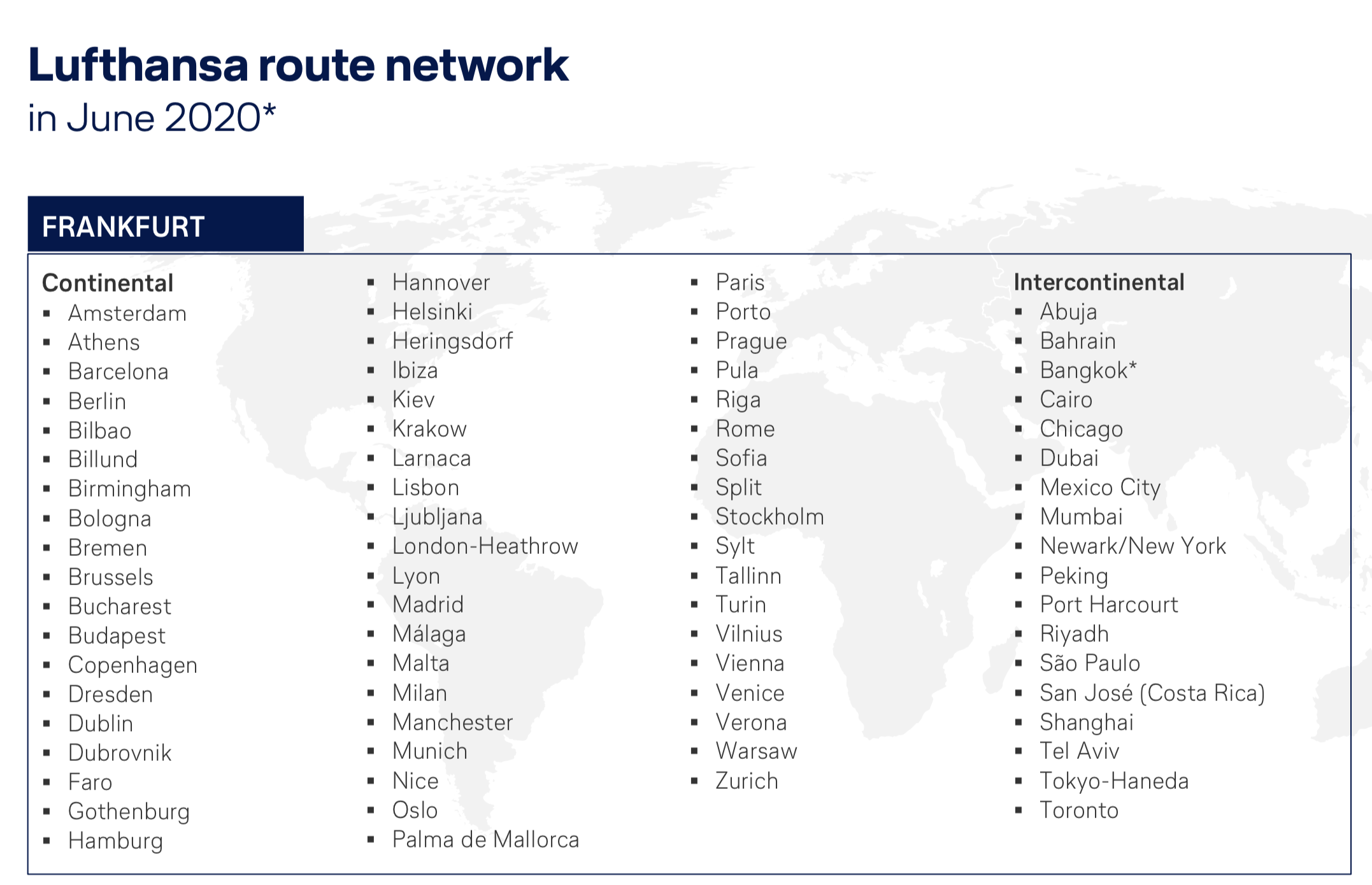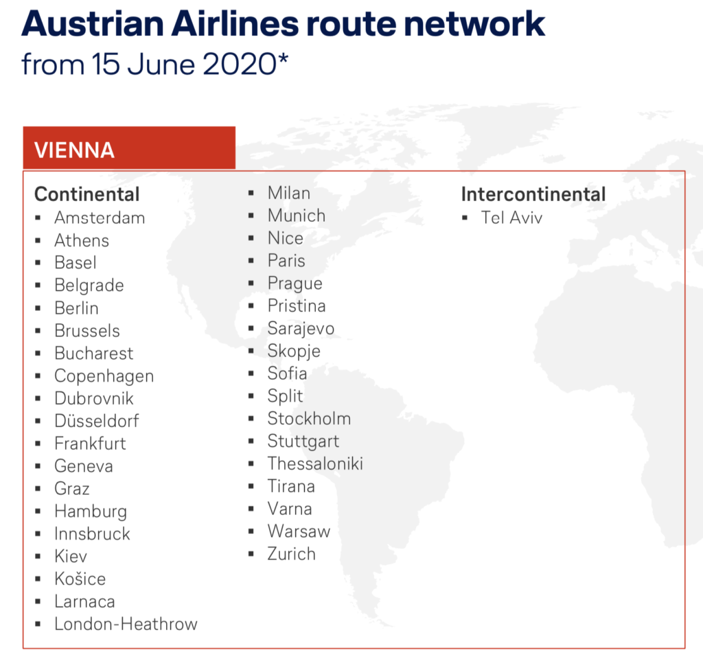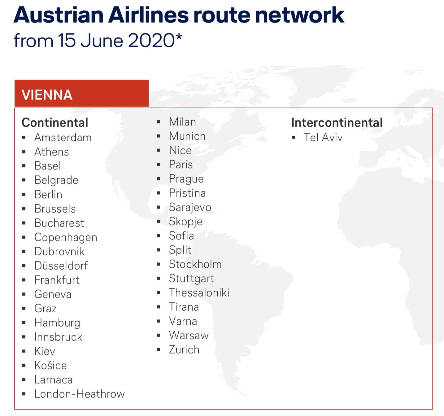 23 destinations in Europe: Athens (ATH), Budapest (BUD), Moscow (DME), Istanbul (IST), Amsterdam (AMS), Stockholm (ARN), Barcelona (BCN), Brussels (BRU), Paris (CDG), Copenhagen (CPH), Dublin (DUB), Edinburgh (EDI), Rome (FCO), Frankfurt (FRA), London (LHR), Madrid (MAD), Manchester (MAN), Munich (MUC), Milan (MXP), Oslo (OSL), Berlin (TXL), Vienna (VIE), Zurich (ZRH)