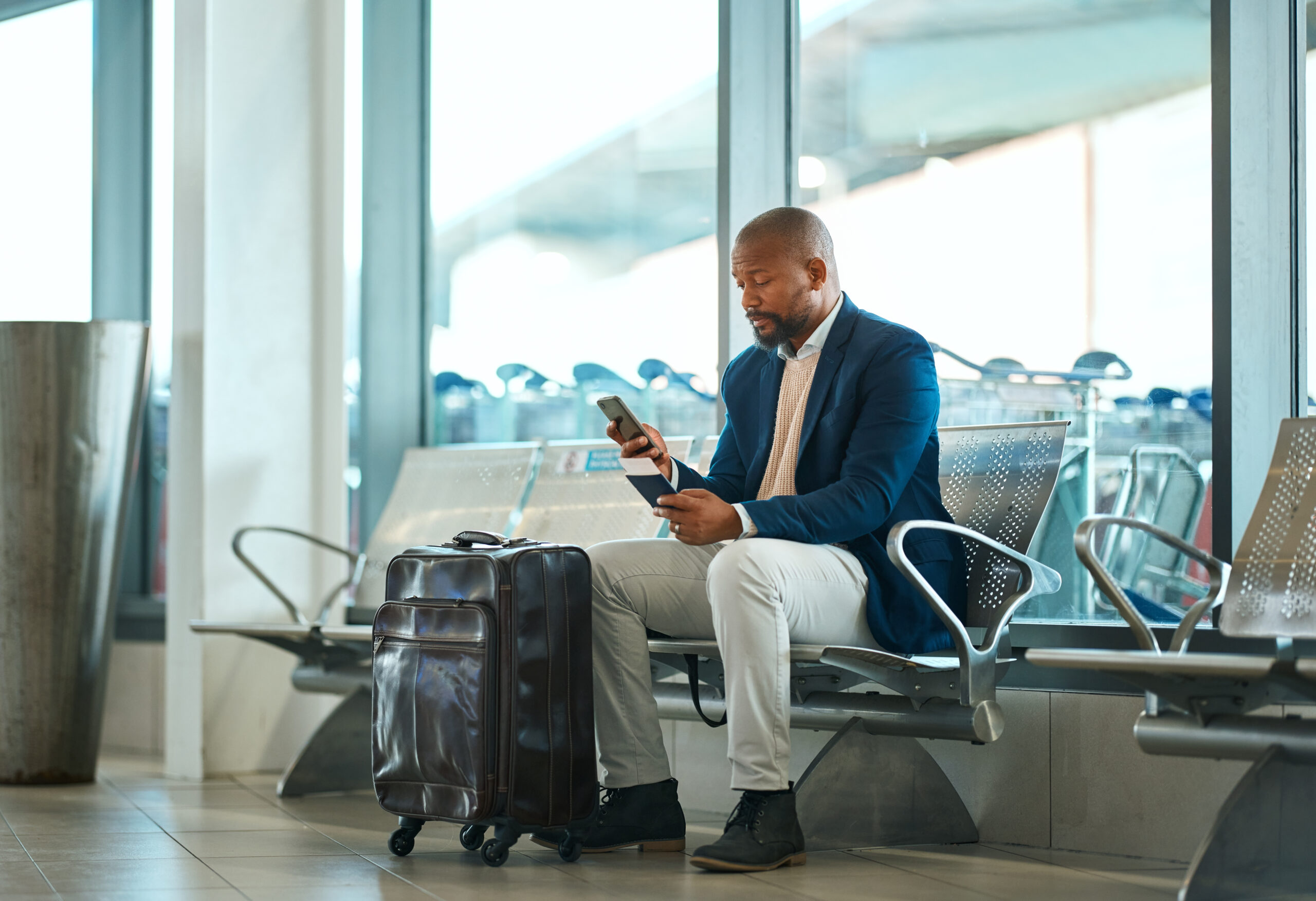 Travel, passport and phone with black man in airport for social media, business trip and and networking. Communication, vacation and email with passenger on layover for first class, app and ticket.