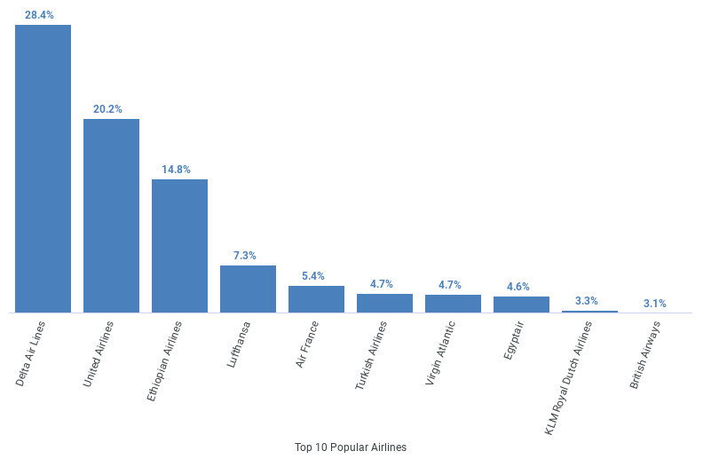 Based on last year’s data, the chart below highlights the most popular airlines flying to Nigeria from the USA. These airlines were the top choices for travelers, reflecting their reputation for reliable service, competitive fares, and convenient routes to Nigeria.